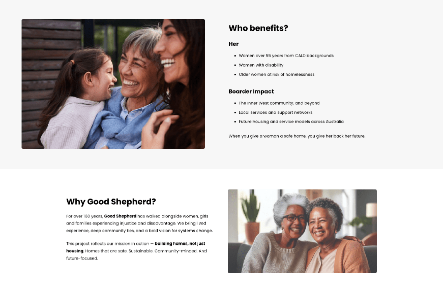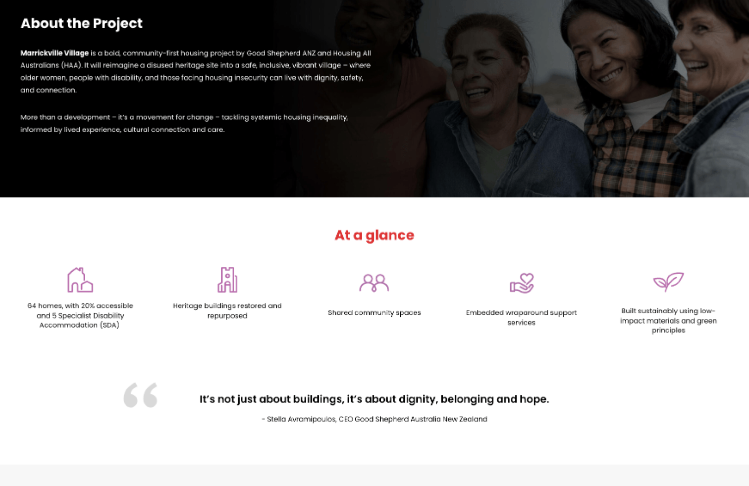 The Marrickville Village microsite provides Good Shepherd with a clear and credible digital presence to support fundraising and partnership conversations: