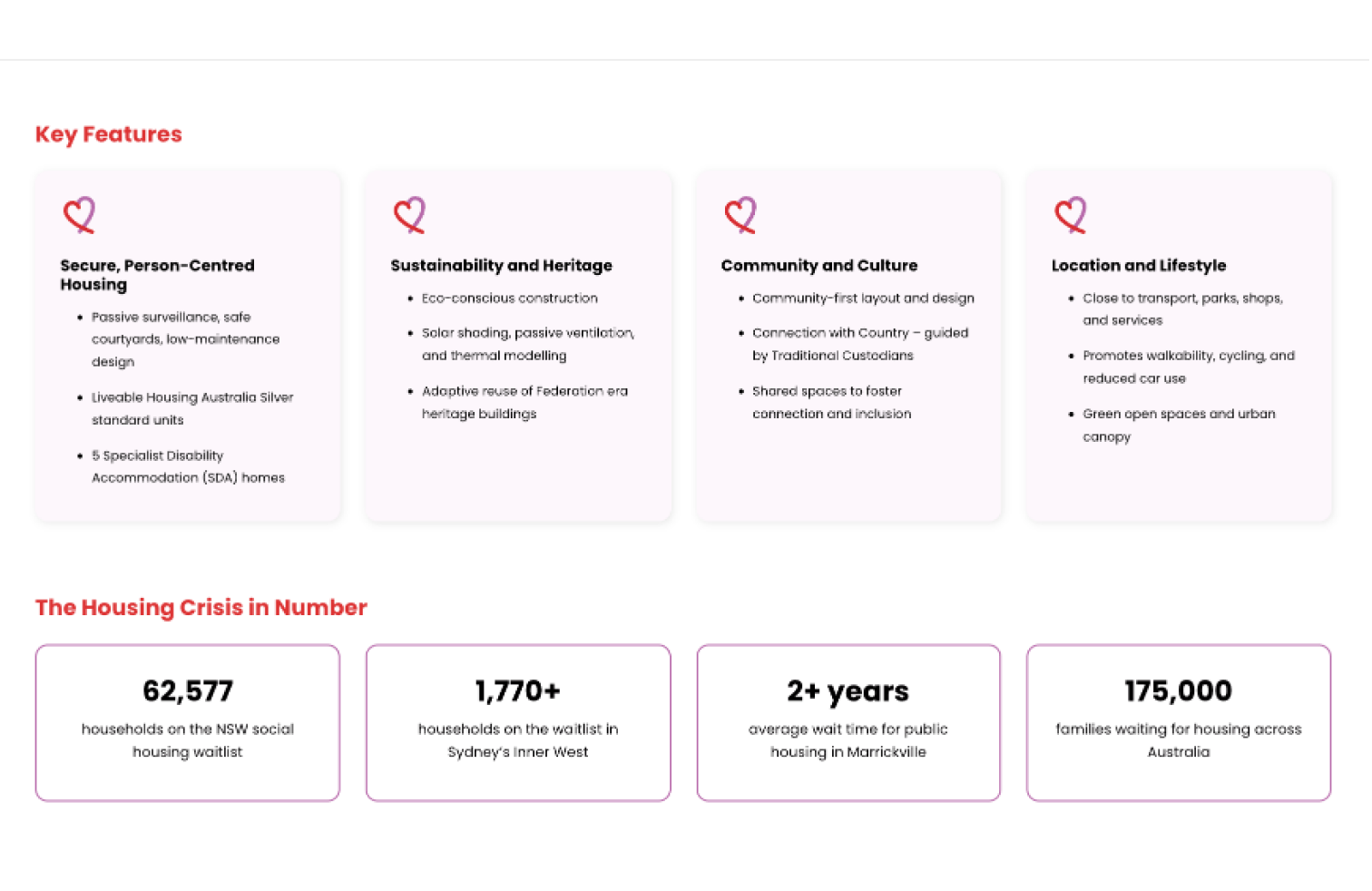 Through close collaboration with Good Shepherd, OSKY delivered a purposeful and scalable microsite that supports the Marrickville Village project’s broader mission for housing equity. By combining clear storytelling, thoughtful design, and practical functionality, the site plays an important role in helping Good Shepherd advocate for change and build the partnerships needed to bring Marrickville Village to life.